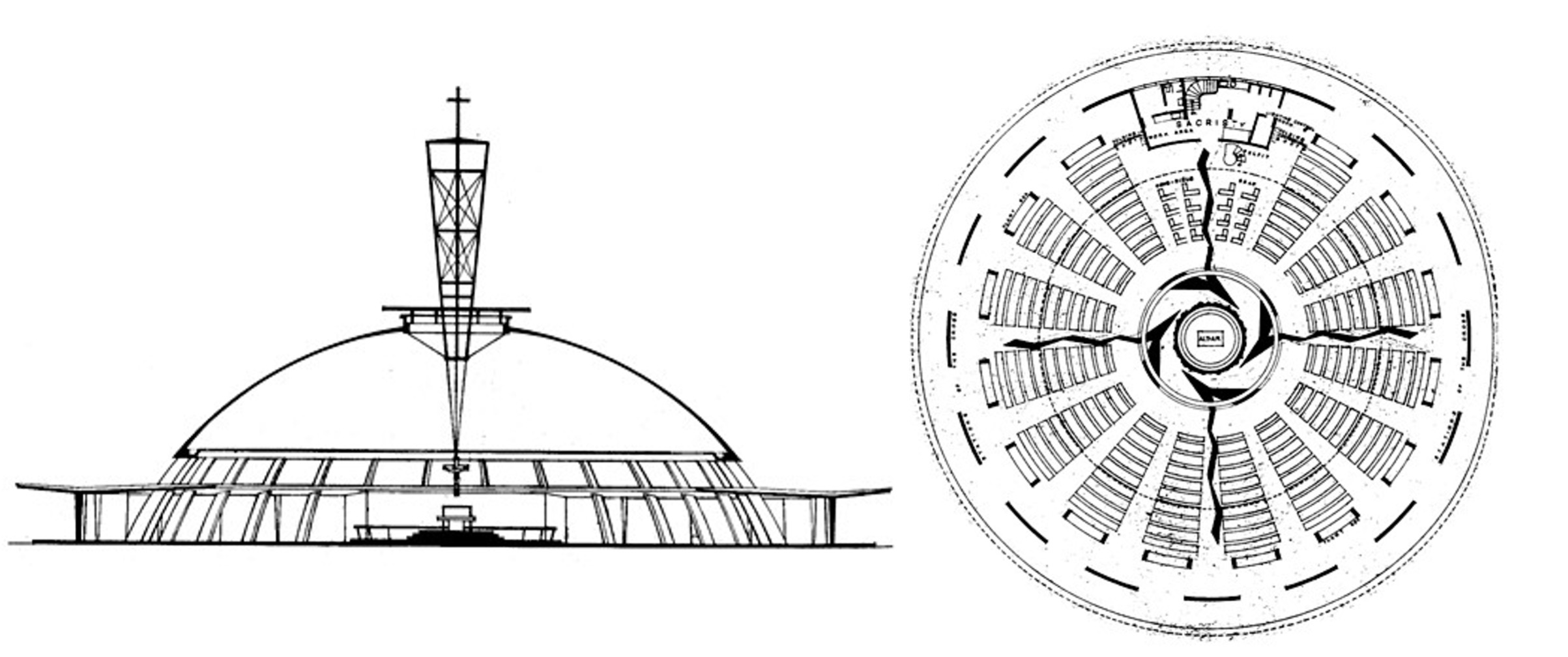 Inside, however, a breathtaking spatial experience. Picture a circular church with the altar at its center, not at the front. The pews radiate concentrically around it, with 14 equidistant open entrances encircling the perimeter; no doors. A thin-shell concrete dome (only 10 centimeters thick at the center) shelters the space, supported by a ring beam and thirty-two reinforced columns. Light pours in through the clerestory windows at the dome’s base, illuminating the interior sufficiently without the need for artificial brightness during the day. The clerestory and the open entrances further allows fresh air to flow through unchallenged, creating a sense of openness. At the dome’s apex, a circular skylight, called an oculus, opens directly to the sky, supporting both the triangular bell tower above and the suspended Crucifix below. The oculus perhaps suggests a rich symbolism of the firmament, as if it is a boundary through which the heavens can peer through into you and the sacred celebration that unfolds below.